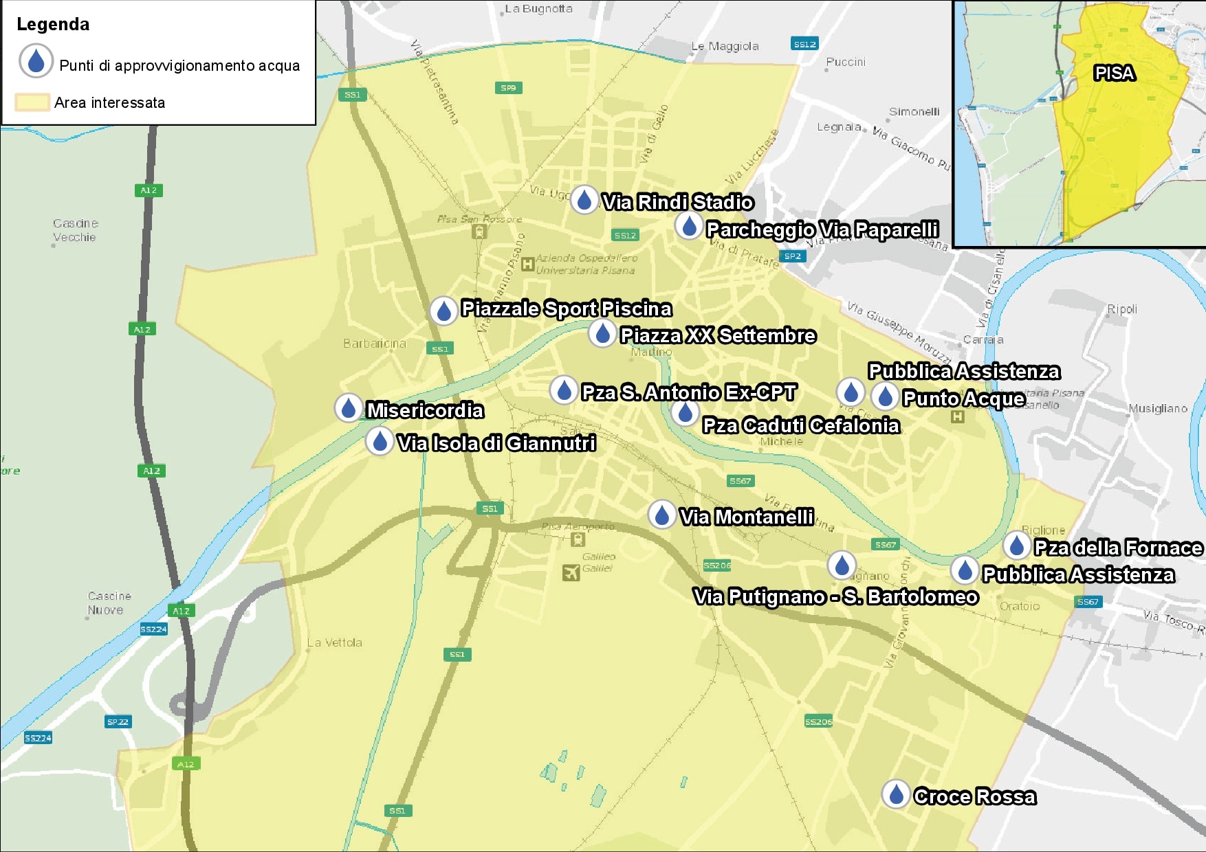 Per limitare i disagi, Acque Spa e l’amministrazione comunale di Pisa, attraverso il dipartimento della Protezione Civile, hanno predisposto un servizio di fornitura idrica sostitutiva per le utenze sensibili ed hanno programmato, su tutto il territorio interessato dall’interruzione, punti di approvvigionamento idrico sostitutivi, a disposizione di tutti gli utenti.