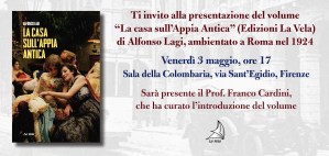FIRENZE – Venerdì 3 maggio, ore 17 presso la Sala della Colombaria, Via Sant’Egidio, Firenze sarà presentato il libro del Dott. Alfonso Lagi “La casa sull’Appia Antica” ambientato a Roma nel 1924 ed Edito da La Vela, nota Casa Editrice di Viareggio. Alla presentazione sarà presente il Prof. Franco Cardini, che ha curato l’introduzione del volume.