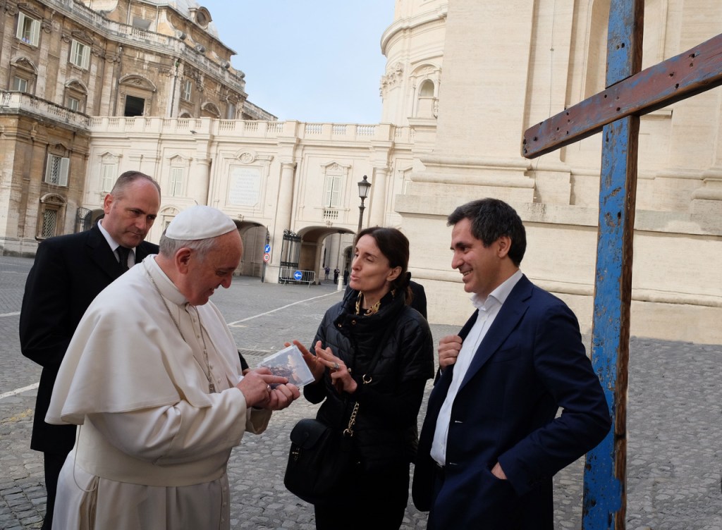 Papa Francesco, Monica Volpini – Armonica Onlus, Arnoldo Mosca Mondadori – Fondazione Casa dello Spirito e delle Arti con la Croce di Lampedusa, opera di Francio Tuccio.